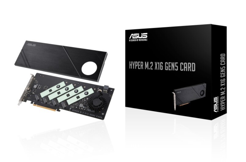 ASUS Hyper M.2 x16 Gen5 Card (PCIe 5.0/4.0) supports up to four NVMe M.2 (2242/2260/2280/22110) devices at up to 512 Gbps for RAID functions across diverse CPU platforms 1 x 6-pin PCIe power connector and two-phase power solution with up to 14-watt output to support the latest NVMe drives Large heatsink and active fan reduces M.2 SSD temperatures for unthrottled transfer speeds and enhanced reliability; additional fan cable connects to the motherboard's chassis fan header to allow the motherboard to control and regulate fan speed Adapted server-grade PCB supports up to four PCIe 5.0/4.0 M.2 drives, with up to 512 Gbps bandwidth for smooth data transfers