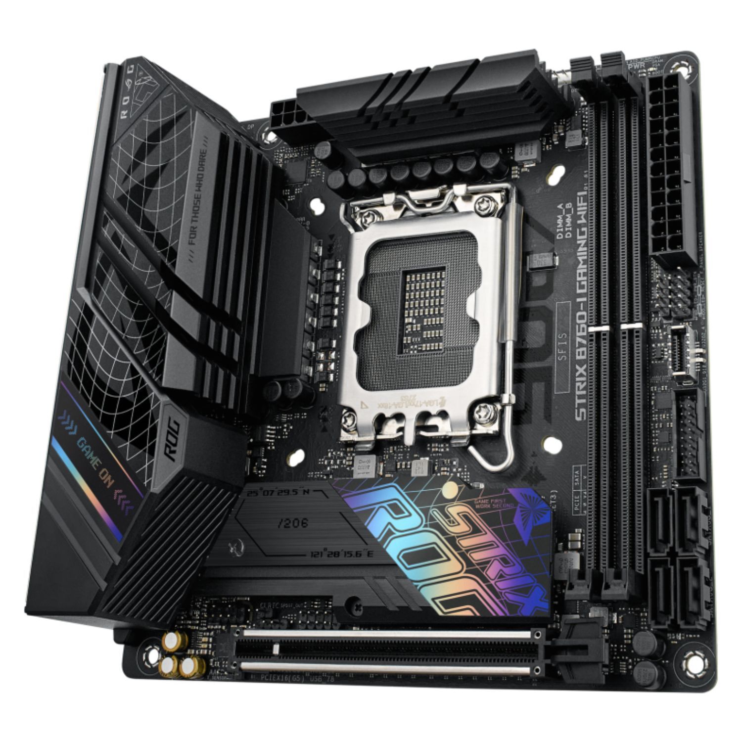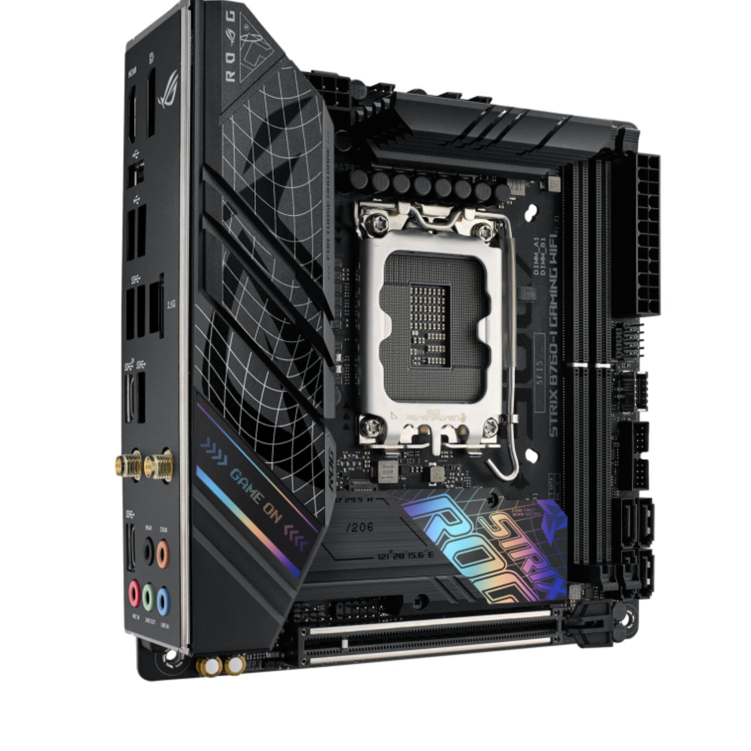 ROG STRIX B760-I GAMING WIFI Let your rig run wild with the ROG Strix B760-I, a feisty foundation for your next SFF build. Boasting hyperfast DDR5 memory, low-latency WiFi 6E networking, and a future-ready PCIe 5.0 slot, it sets you up for savage speeds, all while giving you incredible 13th Gen support thanks to its powerful VRM and thermal solution. ROG STRIX B760-I GAMING WIFI CPU Intel® Socket LGA1700 for 13th Gen Intel® Core™ Processors & 12th Gen Intel® Core™, Pentium® Gold and Celeron® Processors* Supports Intel® Turbo Boost Technology 2.0 and Intel® Turbo Boost Max Technology 3.0** * Refer to www.asus.com for CPU support list. ** Intel® Turbo Boost Max Technology 3.0 support depends on the CPU types. Chipset Intel® B760 Chipset Memory 2 x DIMM, Max. 64GB, DDR5 7600(OC)/ 7466(OC)/ 7200(OC)/ 7000(OC)/ 6800(OC)/ 6600(OC)/ 6400(OC)/ 6200(OC)/ 6000(OC)/ 5800(OC)/ 5600/ 5400/ 5200/ 5000/ 4800 Non-ECC, Un-buffered Memory* Dual Channel Memory Architecture Supports Intel® Extreme Memory Profile (XMP) OptiMem II * Supported memory types, data rate(Speed), and number of DRAM module vary depending on the CPU and memory configuration, for more information refer to www.asus.com for memory support list. * Refer to www.asus.com for the Memory QVL (Qualified Vendors Lists). Graphics 1 x DisplayPort** 1 x HDMI®*** * Graphics specifications may vary between CPU types. Please refer to www.intel.com for any updates. ** Support 4K@60Hz as specified in DisplayPort 1.4 *** Support 4K@60Hz as specified in HDMI 2.1.