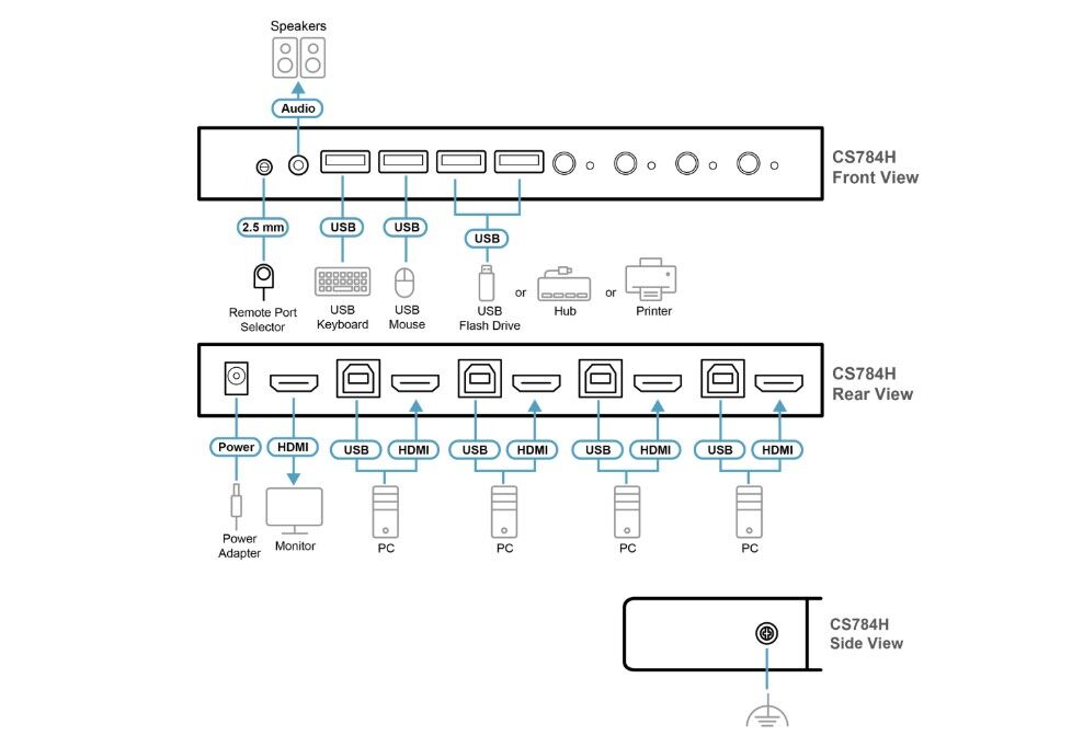 The CS784H is a 4-port desktop KVM switch designed for those who demand a streamlined workflow and uncompromising visual quality across multiple systems. It enables fast, reliable switching between four HDMI computers with up to 4K DCI resolution, while sharing a single keyboard, monitor, mouse, audio output, and USB peripherals through one KVM console. With multiple switching methods “ including pushbuttons, hotkeys, and a remote port selector “ the CS784H is the perfect companion for desktop setups in offices, content creation, remote work, design, and more.