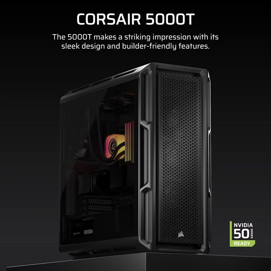 Corsair 5000T Mid-Tower High-Performance PC Case - Black, ATX, 450mm GPU, 250mm PSU, 170mm CPU cooler, 360mm rad, 1x USB-C 3.2 Gen2