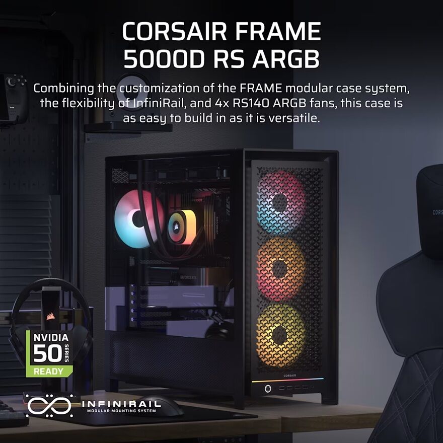 The CORSAIR FRAME 5000D RS ARGB is a modular and spacious mid-tower PC case featuring InfiniRail Fan Mounting System, RapidRoute 2.0 cable management, and is compatible with reverse connector motherboards.