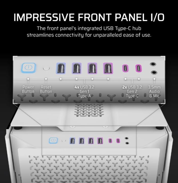 The front panel features an integrated USB Type-C hub that allows you to take full advantage of the cases I O panel regardless of your motherboards capabilities. The integrated DAC drives the front panel audio ports for a premium experience.