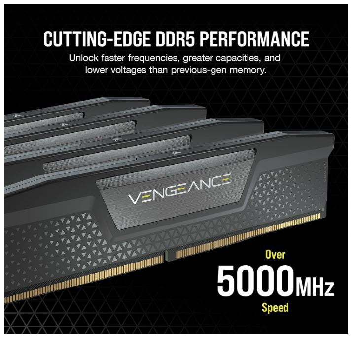 Corsair Vengeance 96GB (2x48GB) DDR5 UDIMM 5600MHz C40 1.25V Desktop Gaming Memory Black Push the limits of your system like never-before with DDR5, unlocking even faster frequencies, greater capacities, and better performance. In the multi-core era, the unprecedented processing speed of DDR5 DRAM ensures your high-end CPU gets data quickly with ease. Whether you are gaming, creating content, opening 100 tabs, or multi-tasking, your gaming PC can power through complex tasks faster than ever before. Illuminate your system with ten individually addressable, ultra-bright RGB LEDs per module, encased in a panoramic light bar. Select from dozens of stunning pre-set lighting profiles, or create your own with near-limitless customization in iCUE. Ditch the tedious process of manually adjusting your performance settings each time when you save your own XMP profiles through iCUE. Easily customize and tailor your setting profiles by app or task for greater efficiency Optimized for the latest generation of DDR5 compatible INTEL® Motherboards. Memory Size 96GB Tested Speed 5600 Tested Voltage 1.25V SPD Voltage 1.1V Speed Rating PC5-44800 (DDR5-5600) SPD Speed 4800MHz SPD Latency 40-40-40-77 Performance Profile XMP 3.0 Package Memory Format DIMM Memory Series VENGEANCE RGB DDR5 Package Memory Pin 288 Interface DDR5 Heat Spreader Aluminum Fan Included No Memory Color BLACK Memory Compatibility Intel 600 Series,Intel 700 Series Memory Detail Compatibility Intel 600 Series,Intel 700 Series