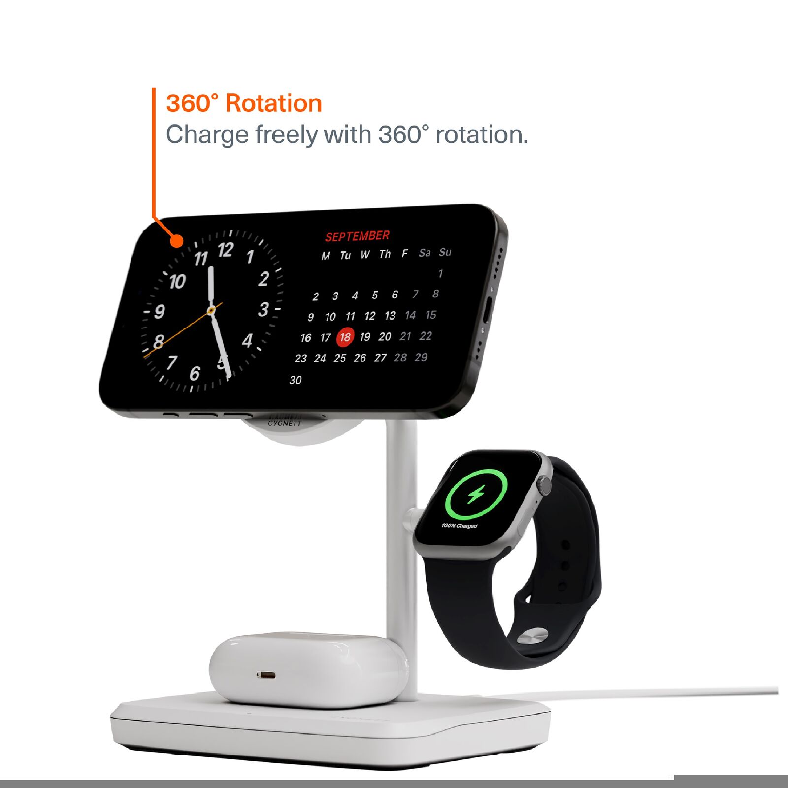 Cygnett ChargeBase Qi2 3-in-1 Magnetic 15W Wireless Charger-White(CY5070BUNCP),1.2M USB-C Cable,5W Watch Charger, 180 degree Swivel Head,2 Years Warra