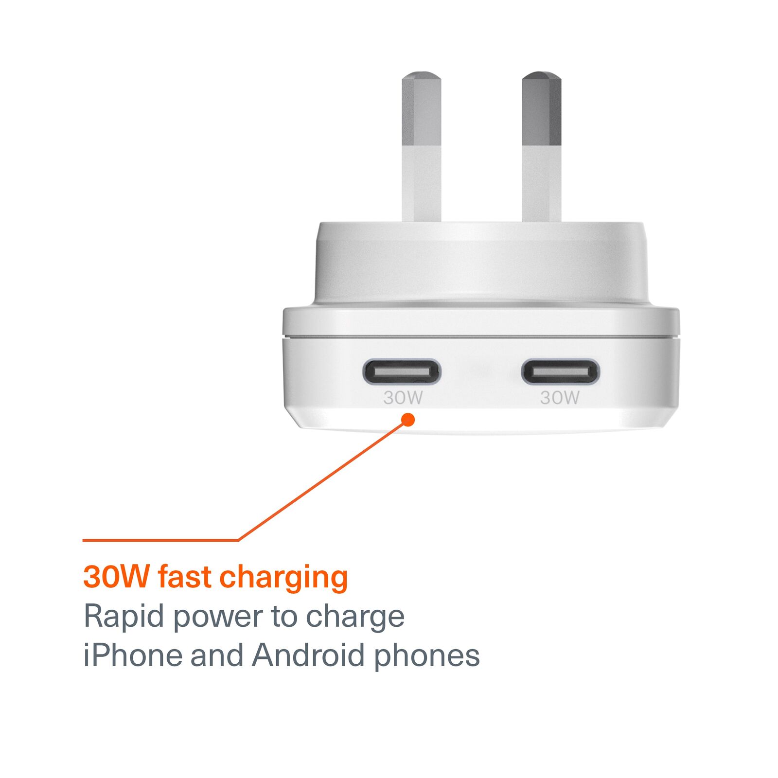 30W fast charging: Rapid power to charge iPhone and Android phones.
