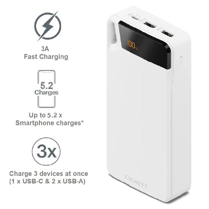 Cygnett ChargeUp Boost 4th Gen 20K mAh Power Bank- White(CY4752PBCHE)Triple Port(Dual USB-A 15W1xUSB-C 15W),15cm USB-C Cable,15W Max,2 Years Warranty