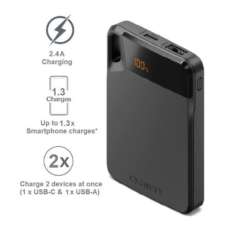 Cygnett ChargeUp Boost 5K mAh Power Bank - Black (CY4743PBCHE), Dual Ports (1x USB-C 12W, 1x USB-A 12W), 15cm USB-A to USB-C Cable, 2 Years Warranty