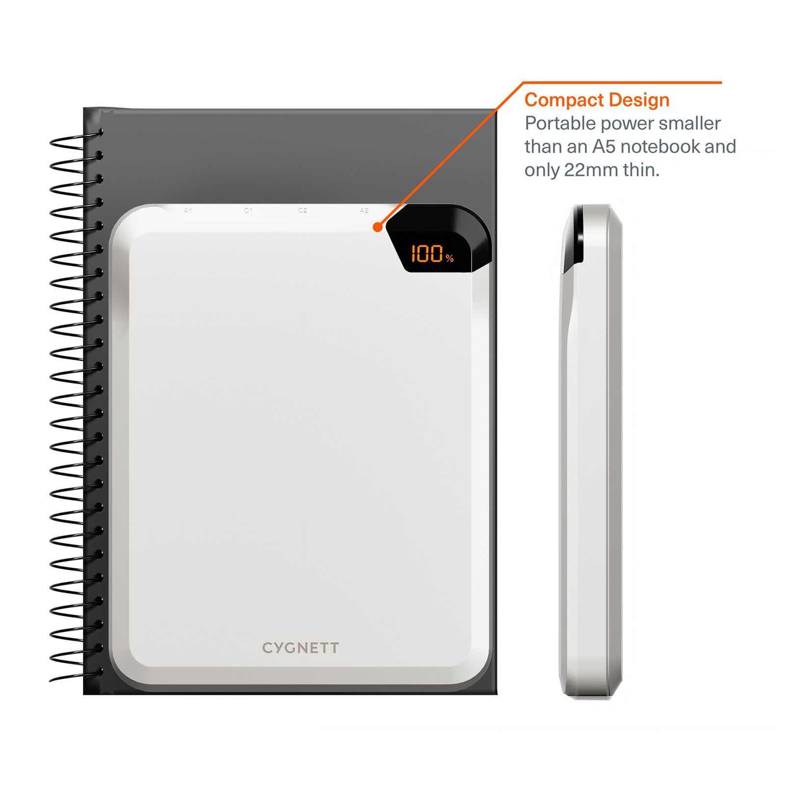 This sleek, portable laptop Power Bank is designed to fit easily in your bag or sit neatly on your desk with its removable stand. Its compact size occupies minimal space on any flat surface where you want to work. This powerhouse delivers up to 100W charging power, either to a single device or shared across four USB charging ports, allowing you to charge up to four devices simultaneously.