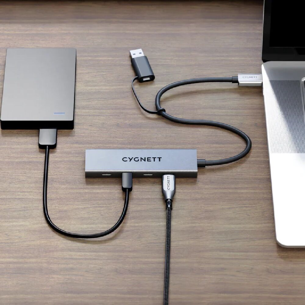 Designed for both form and function, the 4-in-1 USB-C USB-A Hub boasts a compact, lightweight design, making it perfect for on-the-go use, desks, and workspaces.