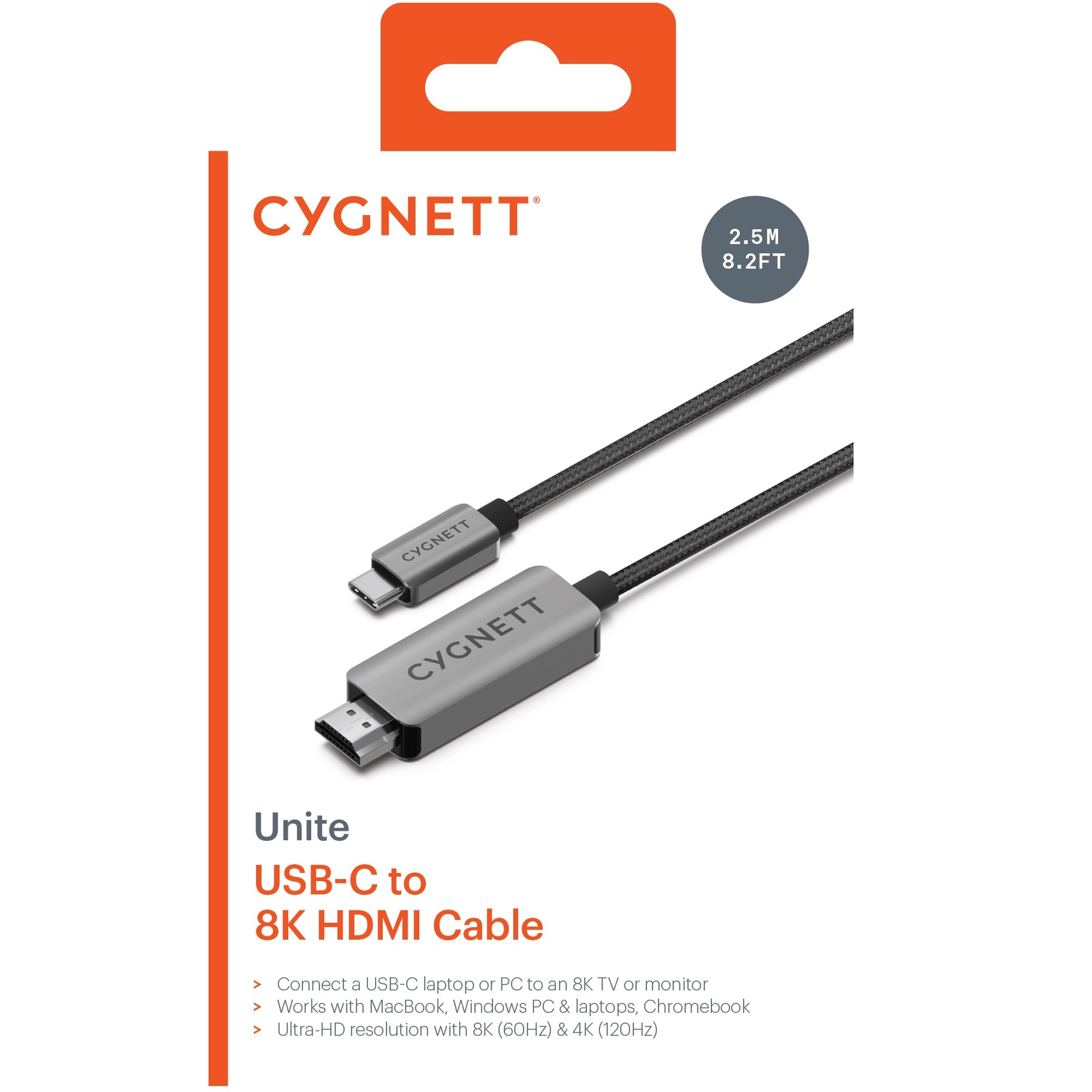 Cygnett Unite 8K USB-C to HDMI Cable (2.5M)-Black(CY4545CHDMI)Works with MacBook Windows PC Laptops ChromebookUltra-HD Resolution 8K(60Hz) 4K(120Hz)
