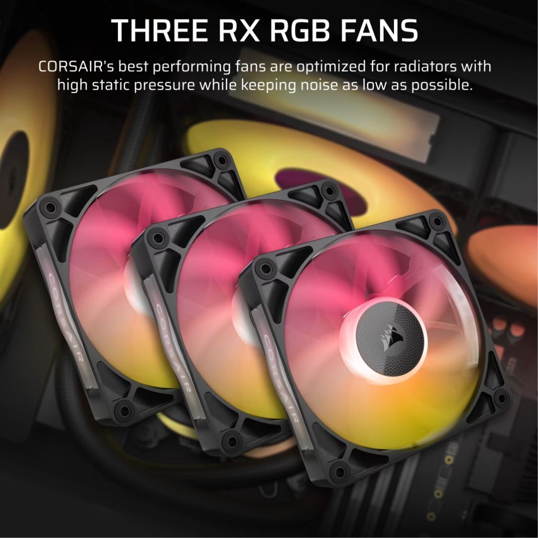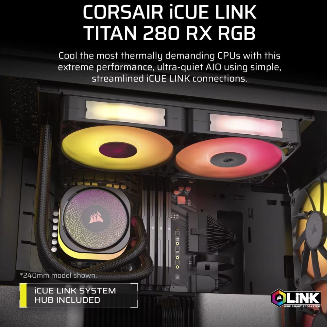 The CORSAIR iCUE LINK TITAN RX RGB delivers high-performance, ultra-quiet cooling with optimized thermal performance, streamlined iCUE LINK connectivity, and dynamic RGB lighting.