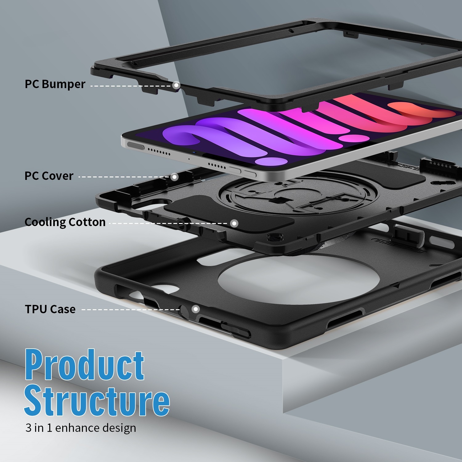 Unyielding Protection for Your Apple iPad Mini (8.3') – Black Elevate your tablet's defense with our premium rugged case, engineered to endure the harshest environments. Crafted for ultimate durability, this case offers unparalleled impact resistance and robust functionality. Built for Toughness: Our rugged case is designed with a resilient exterior that guards against drops, bumps, and shocks. Its fortified construction absorbs and disperses impact, keeping your tablet secure in all conditions. Comprehensive Coverage: Experience full protection with reinforced corners and raised edges that defend against scratches, dust, and dirt. Meeting military-grade standards, this case withstands extreme vibrations, temperatures, and moisture, ensuring your tablet is safeguarded against the elements. Uncompromised Usability: Enjoy seamless access to all your tablet’s ports, buttons, and features without removing the case. Responsive tactile buttons and precise cutouts facilitate effortless use of the camera, speakers, and other essential functions. Convenience and Versatility: Compatible with additional accessories like shoulder straps, hand straps, or kickstands, our case offers versatile carrying and viewing options, perfect for any scenario. Ideal for fieldwork, construction sites, or everyday protection, our rugged tablet case is your device's ultimate safeguard. Trust in its ruggedness and reliability to keep your Apple iPad Mini (8.3') safe, no matter where you are.
