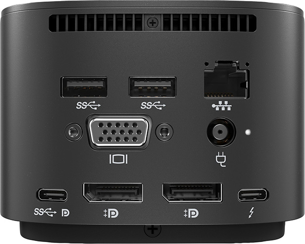 Front: 1 USB-C„ port with data and power out (15W); 1 USB-C„ cable to connect to host system (0.7 meter cable length); Side: 1 powered USB 3.0 port; 1 combo Audio Jack; 1 Kensington lock slot; Back: 1 Thunderbolt„ port; 1 USB-C„ DisplayPort„ data and power out (15W) port; 2 DisplayPort„ ports; 1 VGA port; 2 USB 3.0 ports; 1 RJ45 port; 1 AC Adapter connector