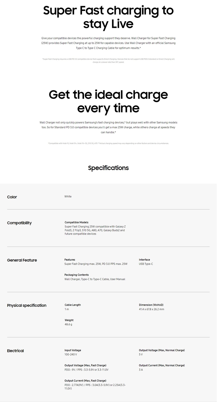 Give your compatible devices the powerful charging support they deserve. Wall Charger for Super Fast Charging (25W) provides Super Fast Charging at up to 25W for capable devices. Use Wall Charger with an official Samsung Type C to Type C Charging Cable for optimum results.*