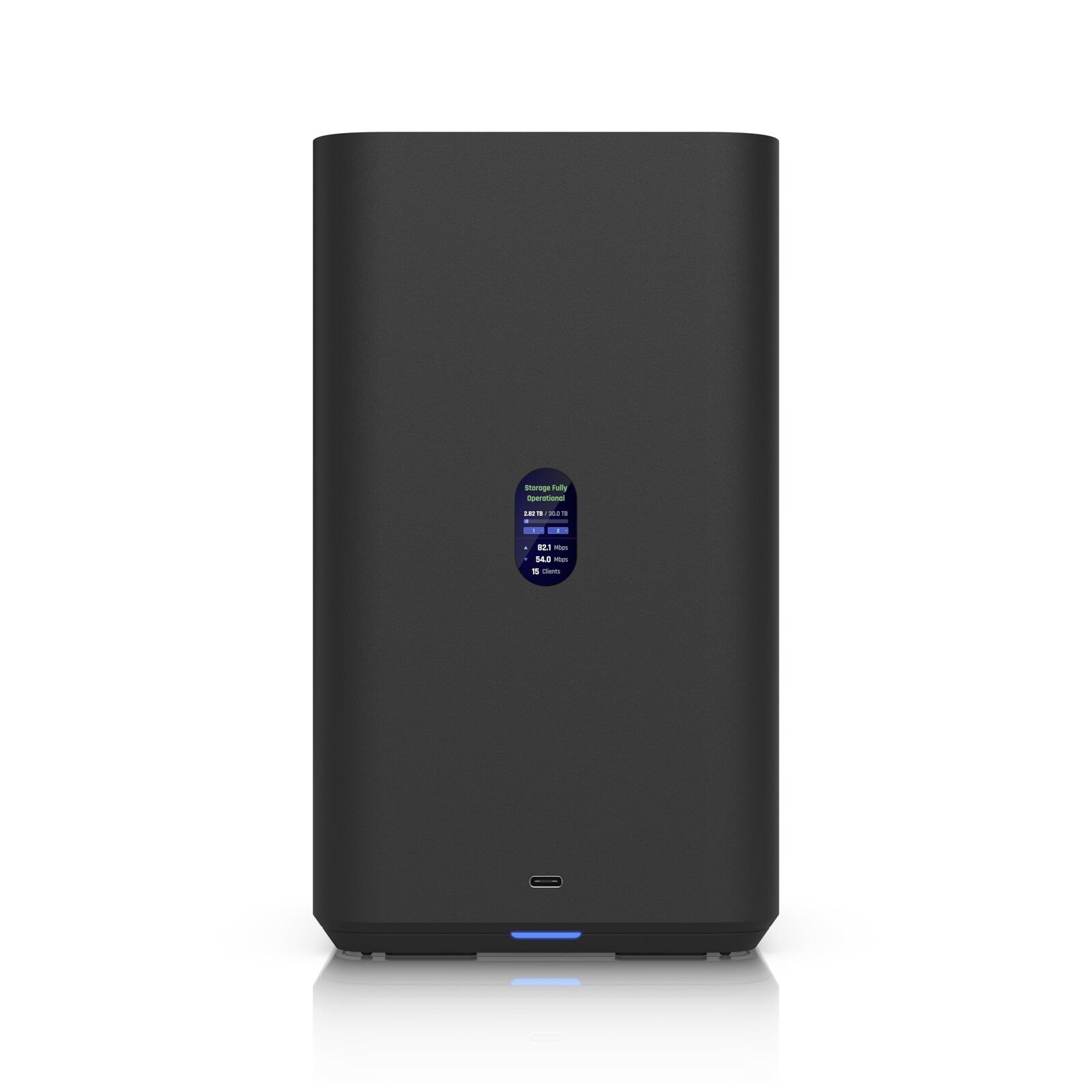 UniFi Network Attached Storage with (2) 3.5 ft HDD bays, 2.5 GbE networking, USB-C connectivity, and an included PoE adapter, all in a compact footprint.