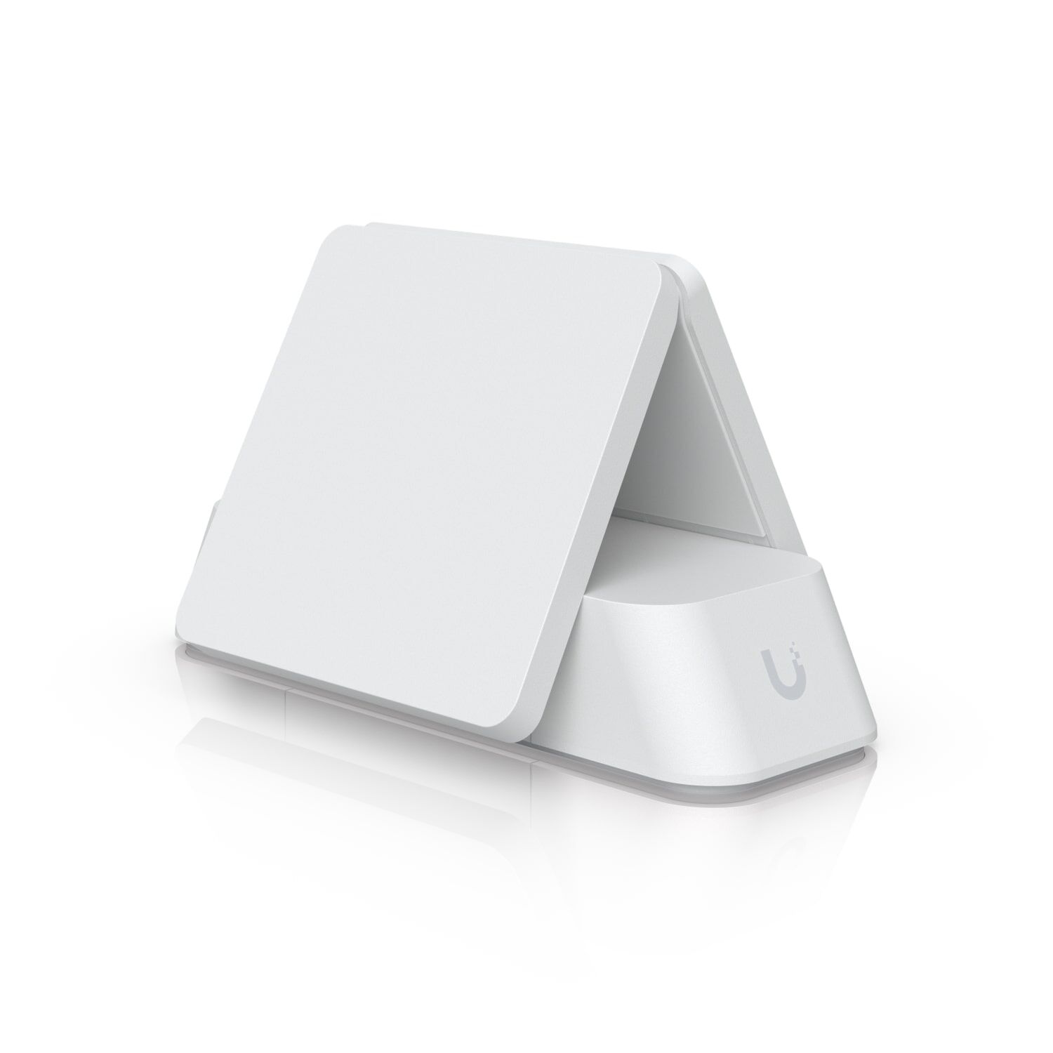 Description: Weighted stand with adjustable clamp keeps non-rack UniFi devices upright on flat surfaces.