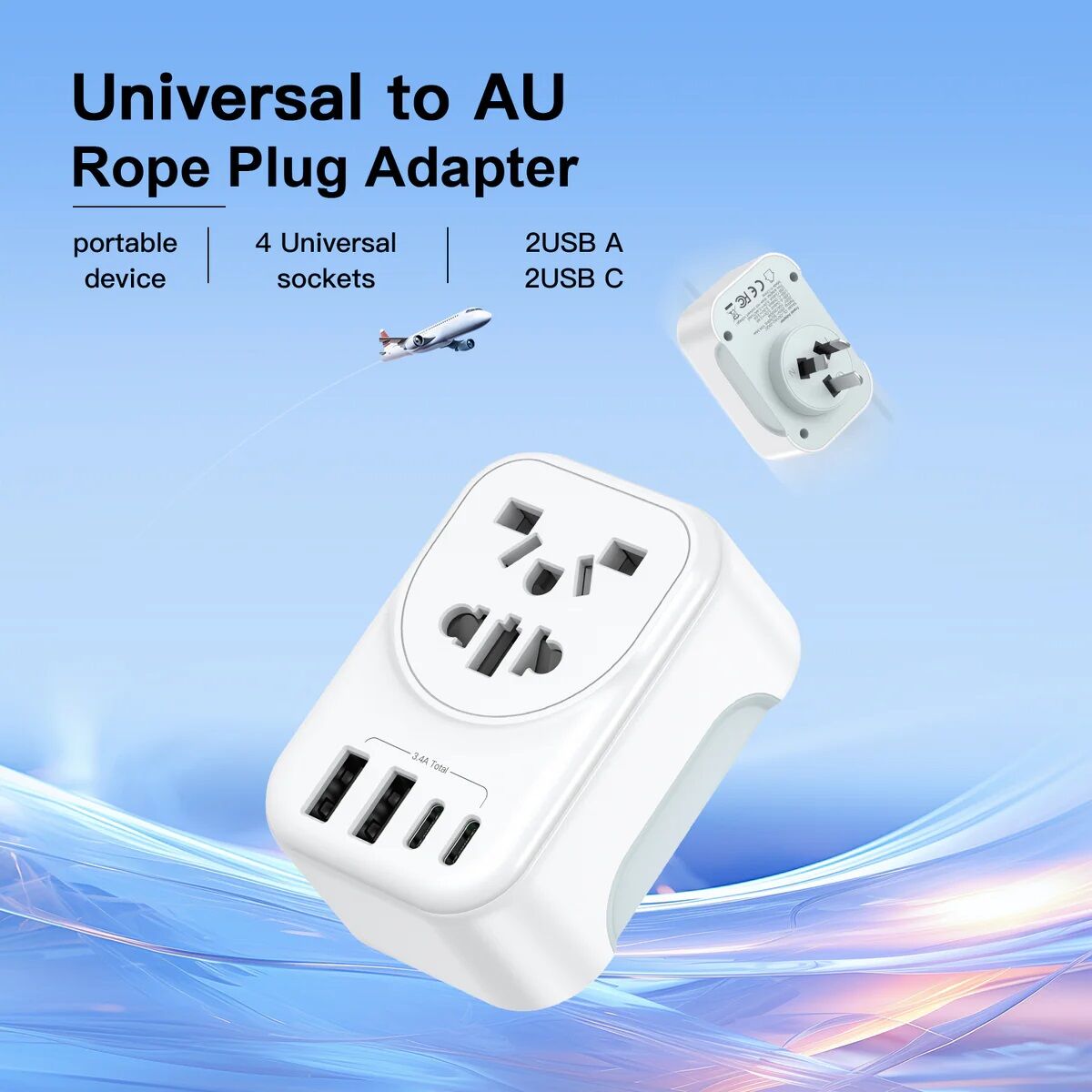 USP Australian Inbound Travel Adapter 2 USB-A 2 USB-C AC Socket, Portable device, 4 Universal Sockets, SAA Certification, 2 Year Warranty